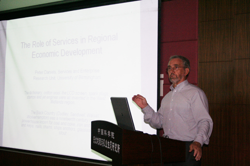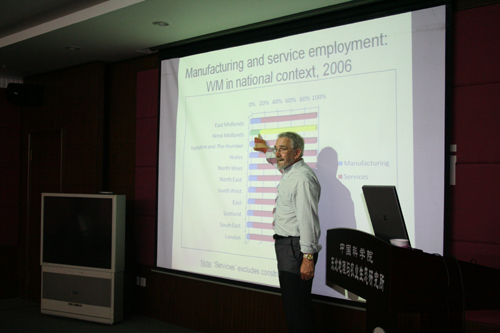 受吉林省外國(guó)專家局引智項(xiàng)目資助,英國(guó)伯明翰大學(xué)地理\地球與環(huán)境科學(xué)系Peter W Daniels教授于7月20日-26日應(yīng)邀訪問(wèn)我所進(jìn)行學(xué)術(shù)交流與合作。7月22日上午Peter W Daniels教授在我所做了學(xué)術(shù)交流報(bào)告, 題目是“The role of services in regional economic restructuring”,以英國(guó)伯明翰和西米德蘭地區(qū)為例,分析了服務(wù)業(yè)尤其是生產(chǎn)者服務(wù)業(yè)的發(fā)展特征、空間分布規(guī)律和影響因素,對(duì)伯明翰和西米德蘭地區(qū)的服務(wù)業(yè)發(fā)展態(tài)勢(shì)進(jìn)行了闡述。張平宇研究員,馬延吉副研究員等科研人員和研究生與Peter W Daniels教授進(jìn)行了熱烈的討論與交流。