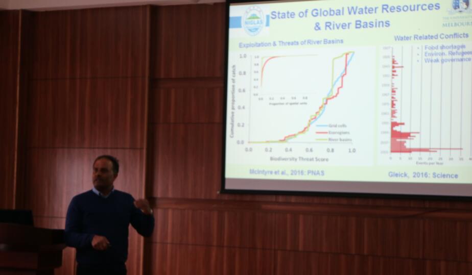 作為湖沼學和古湖沼學家,目前,Giri主要從事澳大利亞墨累河流域和中國長江流域濕地古生態,食物網和水資源管理的研究,現致力于中國長江流域濕地和中國西南高山湖泊的研究。交流會上,Giri總體介紹了全球水資源形勢以及澳大利亞墨累河流域和中國長江流域當前的水資源狀態;分析了氣候改變、溫度、土地利用等對水質的影響,并提出在水資源管理中以水蚤化石為指示生物的應用前景;探討了未來需要開展的重點研究方向。