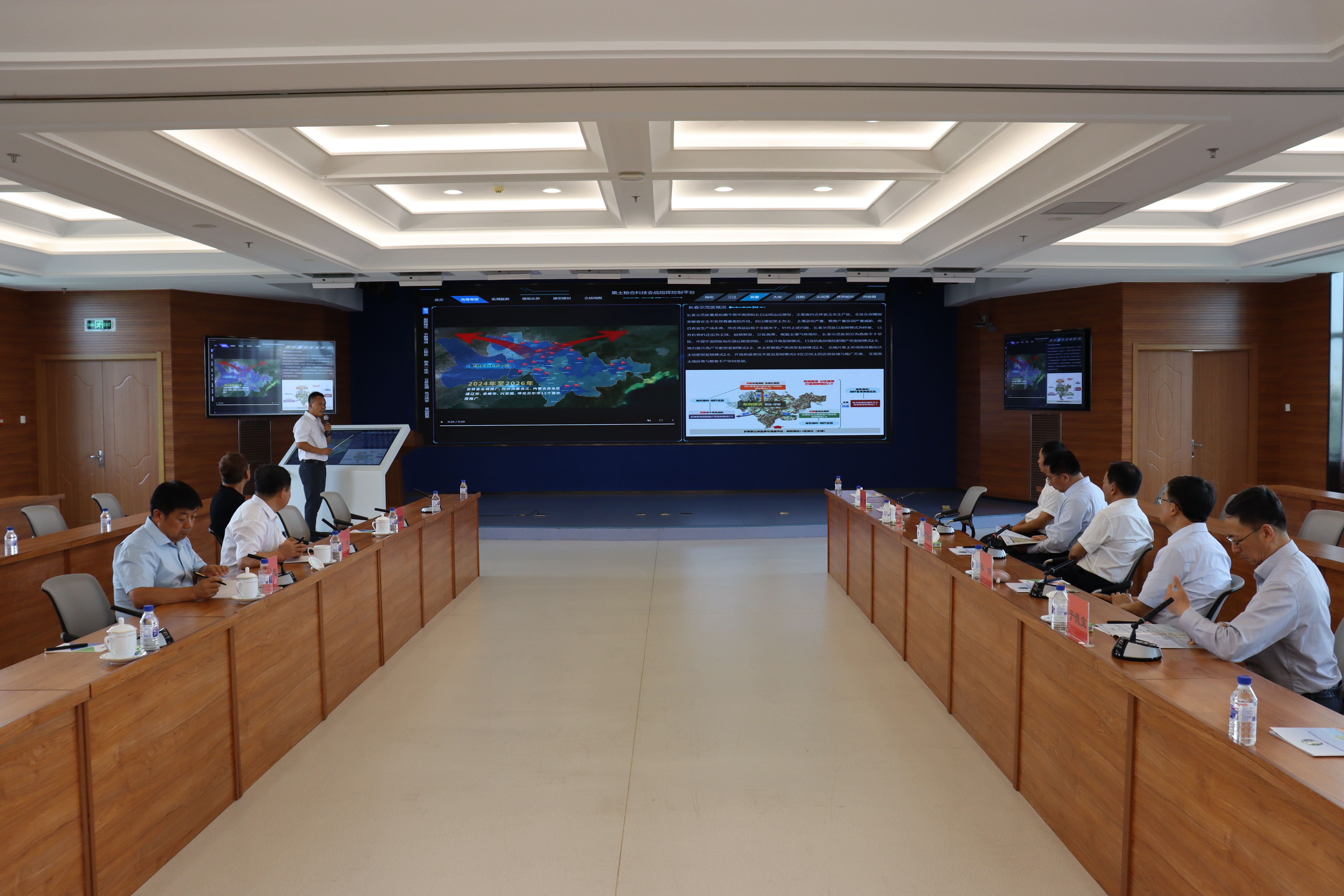 在“黑土糧倉”科技會戰(zhàn)指揮中心,調(diào)研組一行察看了黑土?xí)?zhàn)主要產(chǎn)品。重大項(xiàng)目辦公室主任崔明星結(jié)合黑土糧倉科技會戰(zhàn)指揮平臺,介紹了“黑土糧倉”科技會戰(zhàn)背景、組織模式、區(qū)域適宜性技術(shù)模式及示范推廣等工作成績,演示了科技會戰(zhàn)指揮系統(tǒng)。