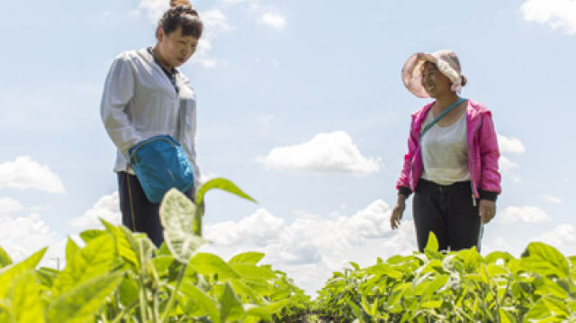 李艷華在農(nóng)民王淑艷的地里查看大豆長勢。(新華社記者劉宇軒攝,2018年6月27日)
