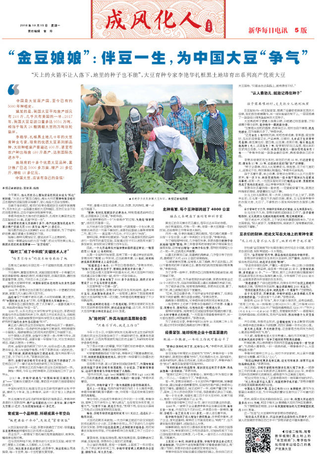 新華社北京10月15日電(記者謝銳佳、管建濤、楊喆)10月15日,《新華每日電訊》刊載題為《“金豆娘娘”:伴豆一生,為中國大豆“爭氣”——“天上的火箭不讓人落下,地里的種子也不能”,大豆育種專家李艷華扎根黑土地培育出系列高產(chǎn)優(yōu)質(zhì)大豆》的報道。