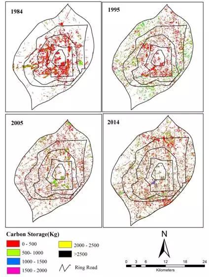 研究團隊應用遙感與實地測量相結合的方法,構建了城市森林碳儲量時空估測模型,揭示了快速城市化過程中城市森林結構及其碳儲量的時空演變規律。研究發現,快速城市化過程中,城市森林覆蓋度總體呈現出逐漸增加的變化趨勢,但其斑塊破碎化逐漸加重;城市森林郁閉度、葉面積、基部斷面積等都呈現出逐漸降低的變化趨勢。在城市森林減緩碳排放方面,研究團隊明確了快速城市化過程中城市森林在應對城市碳排放中的貢獻:在1984~2014年間城市森林碳儲量逐漸增多(大多集中于郊區),其年增加量為6Gg,可抵消年增加CO2排放量的4%。城市森林碳密度呈現出從郊區到中心逐漸降低的變化趨勢,但隨著時間的推移,城市森林質量有所提高,城市森林碳密度逐漸升高。