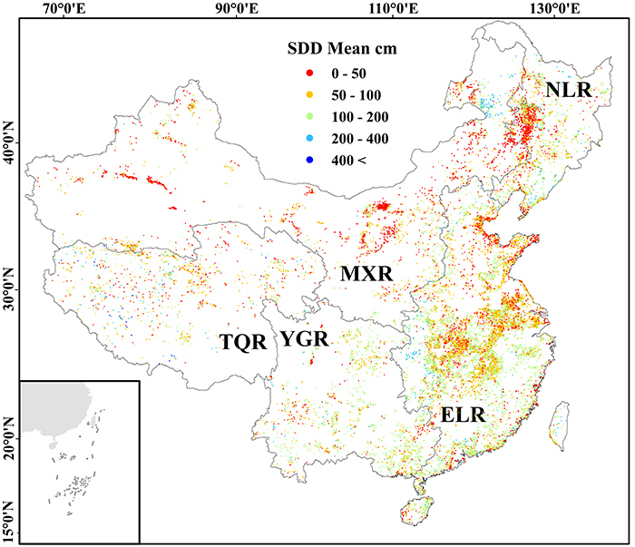 中國科學(xué)院東北地理與農(nóng)業(yè)生態(tài)研究所水環(huán)境遙感學(xué)科組的科研人員歷時6年,對全國湖泊水體SD(湖泊透明度)進行了34次野外調(diào)查分析,基于實測數(shù)據(jù)與Landsat OLI遙感數(shù)據(jù),構(gòu)建了一種新的基于紅藍波段比值的估算SD遙感模型,首次實現(xiàn)了30米分辨率全國湖泊SD遙感反演。