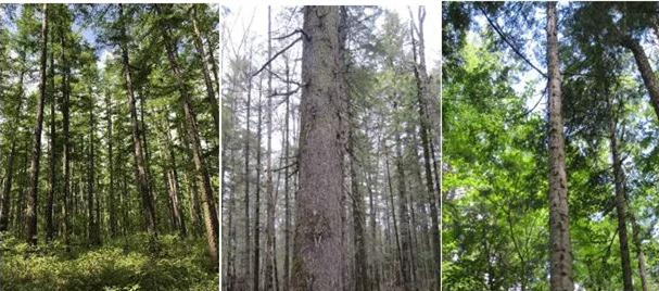 典型森林類型照片(注:2017年7月拍于長白山,從左到右、從上到下依次為長白落葉松、魚鱗云杉、紅松、紫椴和槭樹 )