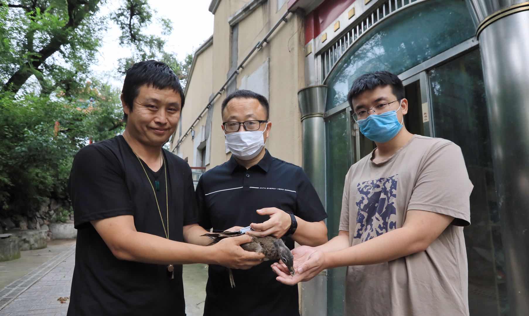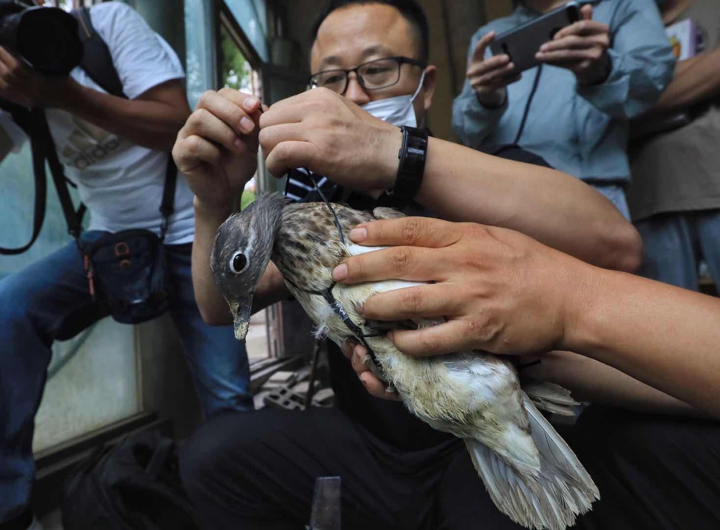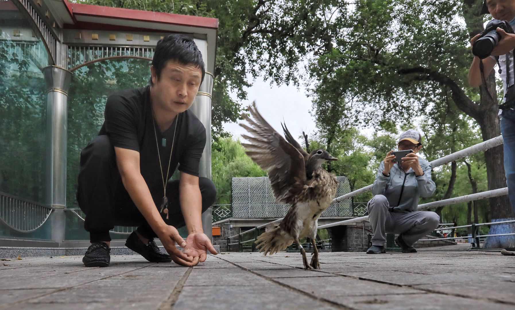 今夏,哈爾濱市兆麟公園內(nèi),南遷而來的鴛鴦共跳巢20窩,出生幼仔185只,創(chuàng)造了歷史紀(jì)錄。為了配合東北濕地鳥類監(jiān)測項(xiàng)目,弄清兆麟公園鴛鴦的遷徙情況,8月7日,中科院東北地理與農(nóng)業(yè)生態(tài)研究所的副研究員王強(qiáng)與車春虎等鴛鴦志愿者一道,給南遷而來的鴛鴦戴上鳥類衛(wèi)星追蹤器。在戴追蹤器之前,王強(qiáng)與車春虎給鴛鴦測量了體重、身高、翅長等基本數(shù)據(jù)。