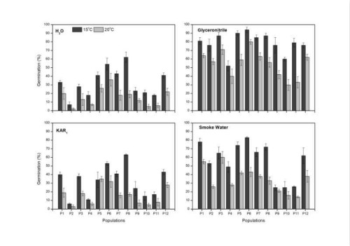 近年來,馬紅媛與澳大利亞多家單位的專家合作,對澳大利亞不同休眠類型植物Boronia floribunda(物理休眠)和Anigozanthos flavidus(形態(tài)生理休眠)的種子開展了系統(tǒng)研究,深入剖析了種子在個體和種群水平上,KAR1、SP1、煙水、熱激及其互作等對種子休眠和萌發(fā)、胚生長動態(tài)等的影響。研究表明,Boronia floribunda種子在個體水平上對煙水的濃度存在顯著差異,保證了部分種子能夠在適宜的環(huán)境下快速萌發(fā);而部分種子則保持休眠狀態(tài)并形成土壤種子庫,這種趨同進(jìn)化保證了該物種在火燒生態(tài)系統(tǒng)中的保存和更新(圖1)。同時,通過對比12個種群的種子萌發(fā)特性(圖2),首次報道了Anigozanthos flavidus種子休眠程度存在的種群水平顯著差異,揭示了深度和淺度休眠差異的種子對不同煙信號及其互作的顯著差異性響應(yīng)特征(圖3),總結(jié)了該物種適應(yīng)火燒及多變復(fù)雜生境的重要繁殖策略。