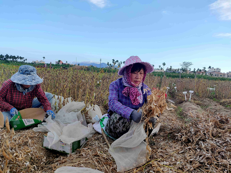 李艷華在海南田間進行大豆脫粒