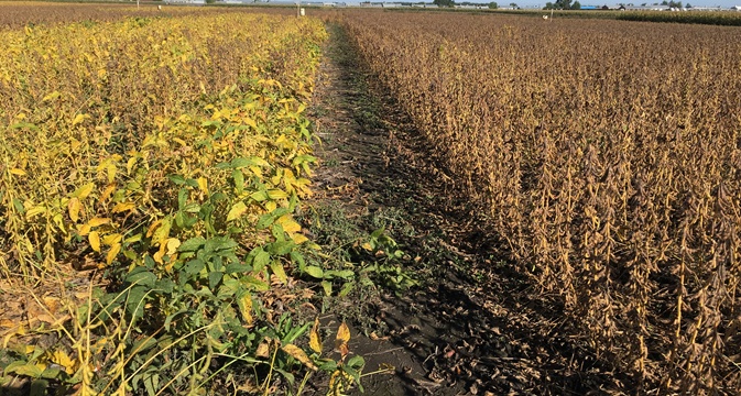 應用黑土地保護利用技術的大豆正常成熟(右)。