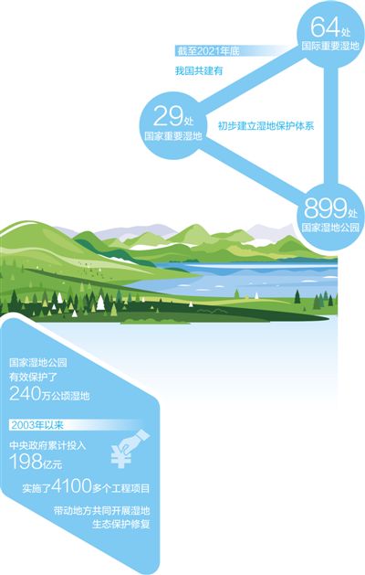 近年來,我國大力推進濕地保護修復(fù),先后出臺《關(guān)于加強濕地保護管理的通知》《濕地保護管理規(guī)定》《濕地保護修復(fù)制度方案》,28個省份出臺省級濕地保護法規(guī)或規(guī)章。截至2021年底,我國共建有64處國際重要濕地、29處國家重要濕地、899處國家濕地公園,初步建立濕地保護體系。但與此同時,隨著經(jīng)濟快速發(fā)展,保護和利用的矛盾日益凸顯。“濕地遭受非法侵占、圍墾、污染等現(xiàn)象時有發(fā)生,保護形勢依然嚴峻。”國家林業(yè)和草原局濕地管理司司長吳志民表示。