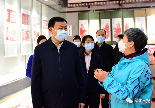 在海倫市剪紙展館,張寶偉與國家級非物質(zhì)文化遺產(chǎn)海倫剪紙藝術(shù)傳承人交流,詳細了解海倫剪紙發(fā)展歷程。他強調(diào),要挖掘好、宣傳好、傳承好海倫剪紙文化,堅定不移走好傳承與發(fā)展之路,增強文化底蘊,不斷創(chuàng)新形式,堅持以歌頌黨、歌頌祖國、歌頌人民幸福生活為根本,創(chuàng)作出更多的藝術(shù)佳作,把海倫剪紙的特色文化品牌持續(xù)叫響。要用好省、市發(fā)展創(chuàng)意設(shè)計產(chǎn)業(yè)的扶持政策,大力發(fā)展剪紙產(chǎn)業(yè),發(fā)揮文藝作品在文化建設(shè)中的重要作用。
