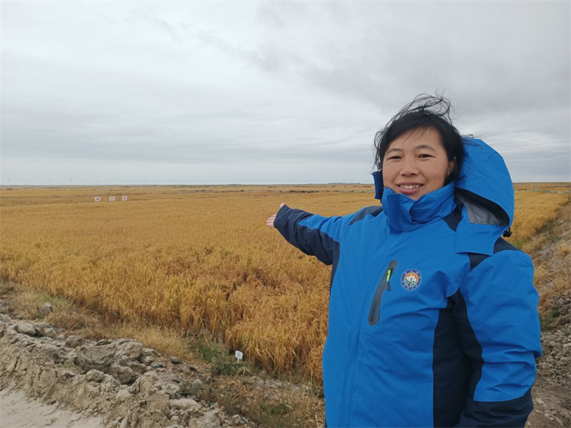 中科院東北地理所高級(jí)工程師劉淼在大安市海坨鄉(xiāng)互助村鹽堿地土壤改良試驗(yàn)示范基地展示改良后的稻田。新華社記者 李雙溪 攝