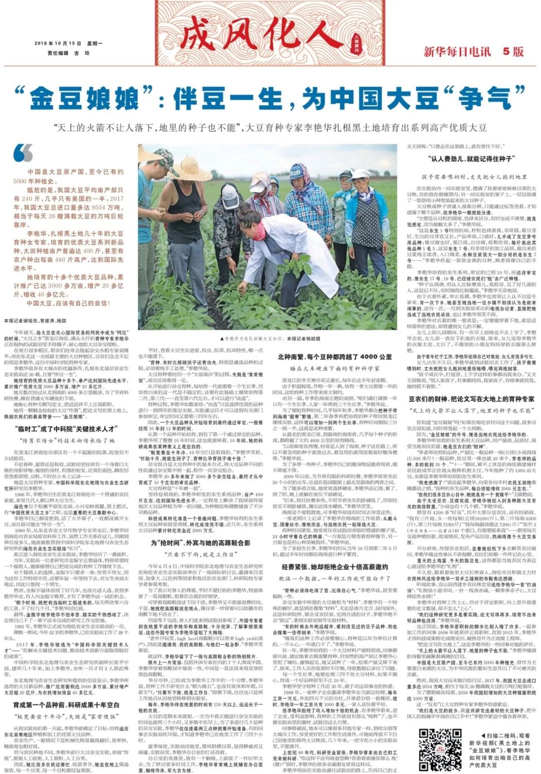 2018年10月15日,新華每日電訊和黑龍江分社聯(lián)合采寫的長篇報道《“金豆娘娘”:伴豆一生,為中國大豆“爭氣”》,報道“女袁隆平”李艷華數(shù)十年如一日、扎根黑土地育豆的感人事跡,因采訪深入,寫作精心,站位高又接地氣,這篇充分體現(xiàn)“四力”的報道推出后,立刻產生廣泛正面影響,讀者紛紛贊譽,并呼吁振興國產大豆。