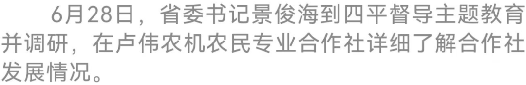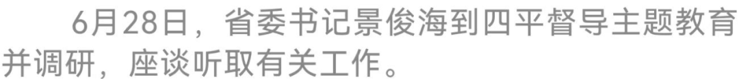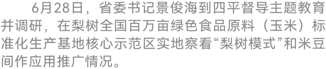 在即將迎來習近平總書記視察吉林三周年之際,省委書記景俊海今天(6月28日)到四平督導主題教育并調研,推動習近平總書記重要講話重要指示精神在四平落地生根、開花結果。他強調,要始終牢記習近平總書記殷殷囑托,保持團結奮斗、真抓實干的勁頭,突出抓好穩(wěn)糧興農、援企興產、營商興業(yè)、拓基興市、惠民興政、保穩(wěn)興治,奮力開創(chuàng)四平高質量發(fā)展新局面。