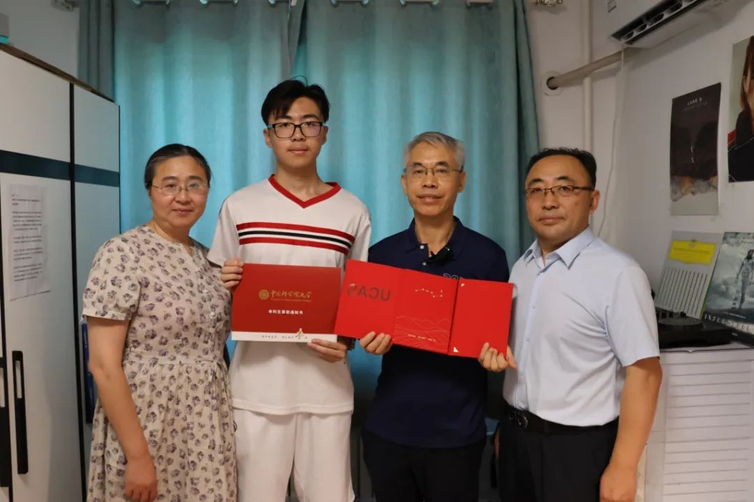 孫奕飛(右三)在家中從國科大數(shù)學(xué)科學(xué)學(xué)院副院長郭田德(右二)手中接過自己的高考錄取通知書。丁典攝