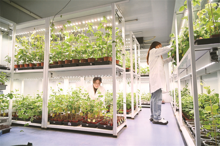 中國(guó)科學(xué)院大豆分子設(shè)計(jì)育種重點(diǎn)實(shí)驗(yàn)室內(nèi),科研人員正在對(duì)大豆生長(zhǎng)表型進(jìn)行觀察和分析。