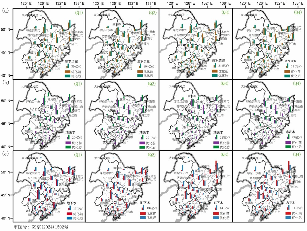 ▲優化前后東北黑土區水資源開發利用對比分析(a)總水資源量(b)地表水資源量(c)地下水資源量(Q1:平水年常規灌溉,Q2:平水年節水灌溉,Q3:枯水年常規灌溉,Q4:枯水年節水灌溉)(圖片來源:中國科學院東北地理與農業生態研究所)