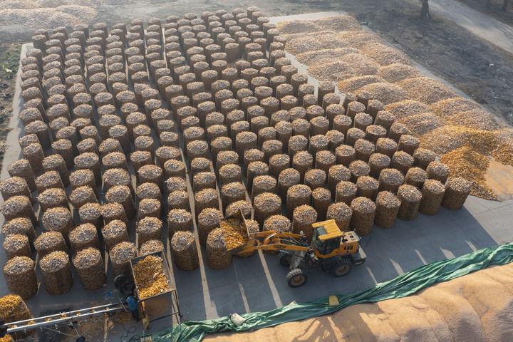 2024年11月13日,在黑龍江省肇東市一處秋糧晾曬場,海城雙麗現代農機專業合作社的農民駕駛農機堆放玉米(無人機照片)。新華社記者 謝劍飛 攝