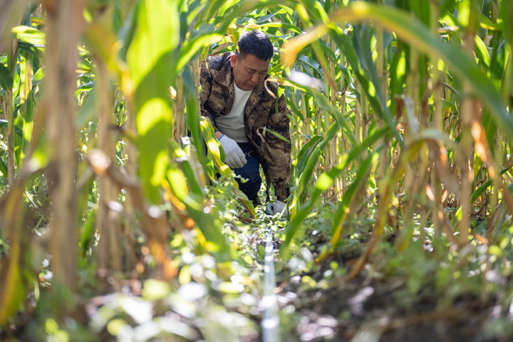 2024年9月24日,黑龍江省寶清縣農業技術推廣中心的農藝師在寶清縣青原鎮一片玉米地中測產。新華社記者 謝劍飛 攝