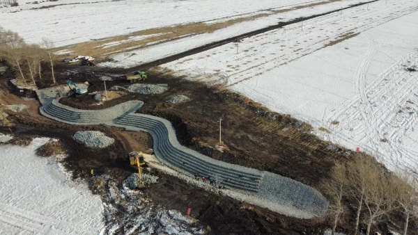 在黑龍江省克山縣華安村,工人們正抓緊建設(shè)溝頭跌水中的上游生態(tài)袋導(dǎo)水地下工程。農(nóng)民日?qǐng)?bào)·中國(guó)農(nóng)網(wǎng)記者 顏旭 攝