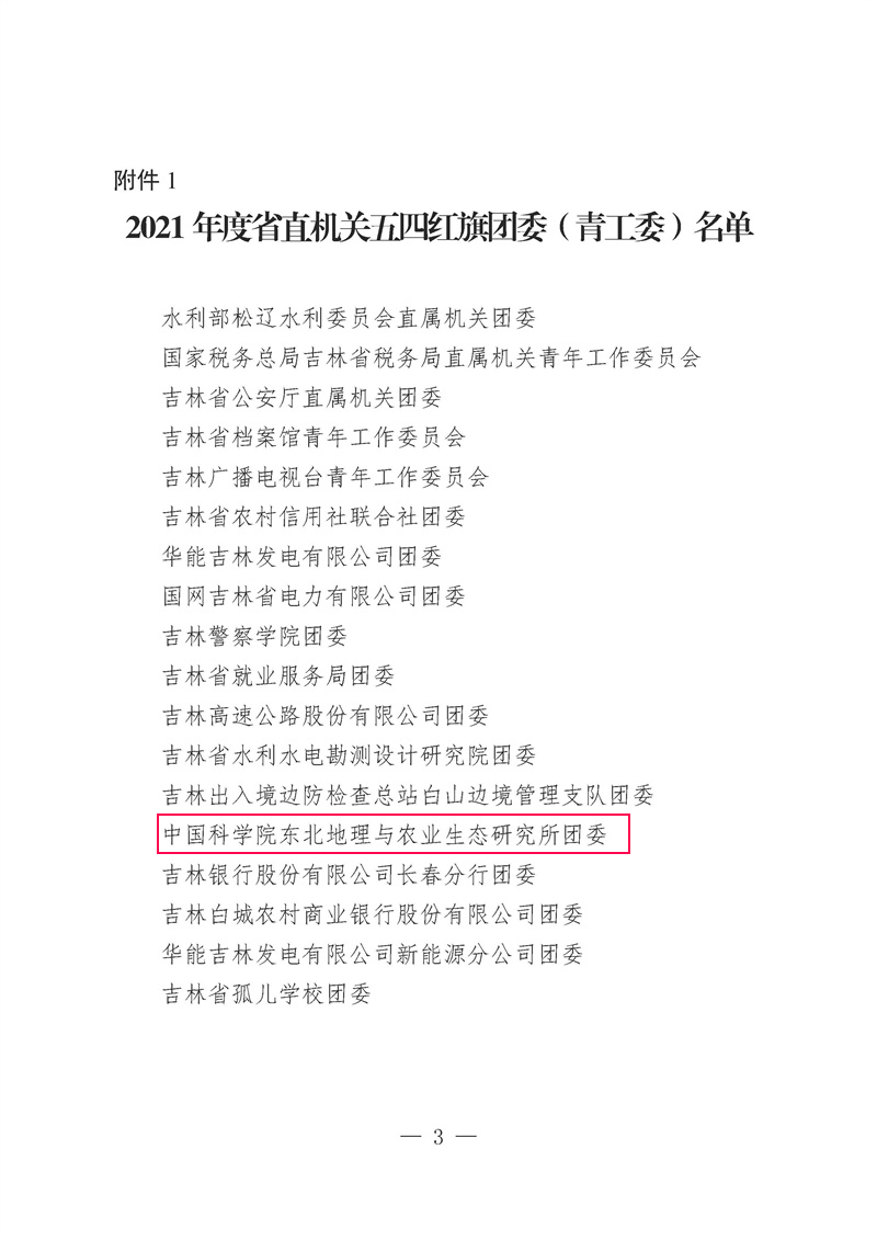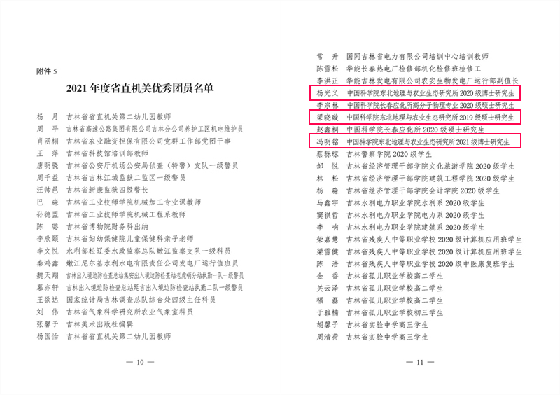 為表揚先進,激勵團青組織和廣大團員青年奮發(fā)有為、再創(chuàng)佳績,省直機關團工委對18個五四紅旗團委(青工委)、24個五四紅旗團支部、33名優(yōu)秀團干部、100名優(yōu)秀團員青年進行通報表揚。中國科學院東北地理與農業(yè)生態(tài)研究所團委榮獲“2021年度省直機關五四紅旗團委”稱號,2020級博士研究生楊光義、2019級碩士研究生梁曉璇、2021級博士研究生馮明銘榮獲“省直機關優(yōu)秀團員”稱號。