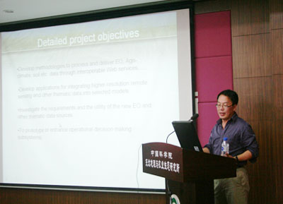 耿曉源主任首先做了題為《Geospatial data integration and decision making: crop yield modeling, drought monitoring, and agricultural water management》的報告,整個報告分為六個部分:加拿大土壤信息系統的概況、核心的問題和商業需求、研究的目的、地理空間數據、主要產出物、進一步研究計劃等。他以加拿大作物產量預測模型、干旱預測和農業用水管理為例,對地理空間數據整合的相關研究和技術作了詳細講解,并對其如何更好地服務于決策過程進行了探討。