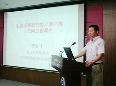 賀紅士研究員做了題為《生態系統研究的尺度外推與空間過程調控》的研究報告,他從“樣點尺度上的結果能代表多大空間或能外推到多大空間”和“某一時間上的觀測結果能在多長的時間尺度上有效”兩個科學問題開始,對生態系統研究尺度外推的主要前沿問題:空間異質性、模擬預測、多尺度融合進行了詳細闡述,同時對其團隊研究開發的LANDIS模型及其在我國小興安嶺森林火災預測中取得的一些成果給大家進行了展示并進行了深入探討。