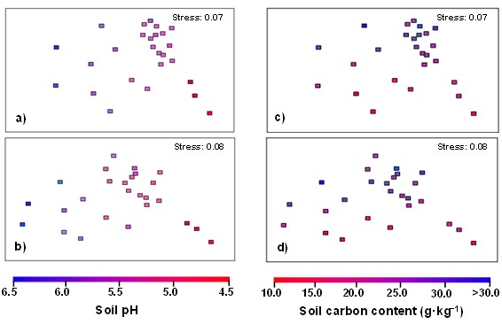 圖1 東北黑土農(nóng)田細(xì)菌群落結(jié)構(gòu)的NMDS分析。圖a和c及圖b和d是基于unweighted和weighted UniFrac群落分析結(jié)果