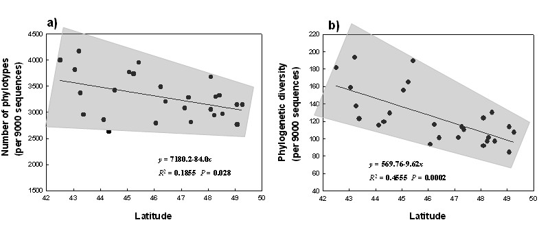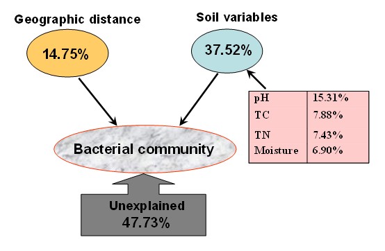 動植物在陸地生態(tài)系統(tǒng)中存在一定的地理分異規(guī)律。與動植物相比,對于陸地生態(tài)系統(tǒng)中數(shù)量巨大、種類多樣的土壤微生物而言,是否存在生物地理分布格局及其驅(qū)動因素是什么?是目前土壤學(xué)和微生物生態(tài)學(xué)研究的前沿科學(xué)問題。已有的研究結(jié)果表明,不同生態(tài)系統(tǒng)中的土壤微生物受到生物和非生物因素的雙重影響,群落結(jié)構(gòu)多樣性及群落結(jié)構(gòu)組成存在較大差異。在這些影響因素中土壤pH被普遍認(rèn)為是制約土壤細(xì)菌群落結(jié)構(gòu)變化的主要因素。值得指出的是,多數(shù)研究均是基于土壤pH值差異較大的不同原始土壤進(jìn)行的,而對于同一種土壤類型,土壤pH值變化較小而其它土壤理化性質(zhì)差異較大時,決定土壤微生物生物地理分布的因素是什么是一個值得探討的科學(xué)問題。