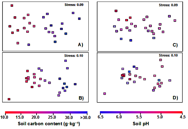 圖1 東北黑土農田真菌群落結構的NMDS分析。圖A和C及圖B和D是基于unweighted和weighted UniFrac群落分析結果