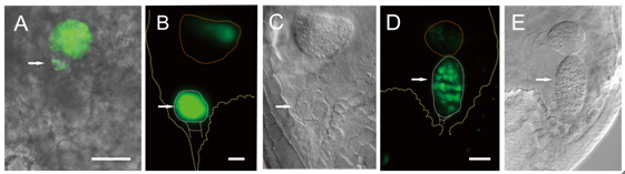 A-E:切斷胚體與胚柄的聯(lián)系后,胚柄的頂端細胞發(fā)育成為了新的胚胎,并且開始表達胚體的標記基因。A-C:胚體標記基因DRN::GFP株系,D-E:ATML::NLS:GFP株系。箭頭所示為胚柄頂部細胞發(fā)育而來的胚體結(jié)構(gòu)。B,C;D,E為同一個胚珠的不同觀察模式。B,D為熒光觀察;C,E為透明觀察。