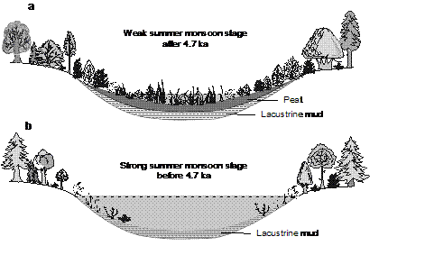 針對這一科學(xué)問題,我所濕地演化與生態(tài)功能學(xué)科組以三江平原天然沼澤濕地為研究對象,進(jìn)行了系統(tǒng)的野外調(diào)查、泥炭柱芯采集和實(shí)驗(yàn)分析,并收集整理分析了已有資料。在此基礎(chǔ)上利用頻率統(tǒng)計(jì)方法確定了三江平原泥炭地發(fā)育的歷史過程。研究結(jié)果表明,盡管三江平原泥炭地的發(fā)育時(shí)期涵蓋了整個(gè)全新世,然而80%的沼澤濕地發(fā)育于4600 yrBP之后的全新世中晚期。根據(jù)沉積相的變化發(fā)現(xiàn)該地區(qū)沼澤濕地的大多是在淺湖消亡的基礎(chǔ)上發(fā)育而來的。已有的研究表明,三江平原氣候?qū)贃|亞季風(fēng)控制的典型溫帶季風(fēng)氣候,早中全新世是夏季風(fēng)相對強(qiáng)盛的季風(fēng)最大期,而4600 yrBP 恰處于東亞夏季風(fēng)衰退的關(guān)鍵期。因此,通過綜合對比泥炭地發(fā)育頻率變化和東亞季風(fēng)演化的規(guī)律,該研究認(rèn)為三江平原泥炭地的發(fā)育主要受控于東亞夏季風(fēng)強(qiáng)度的變化。在早中全新世東亞夏季風(fēng)最大期,強(qiáng)盛的夏季風(fēng)帶來充足的降水,使三江平原低洼地貌區(qū)域形成水位較深的淺湖環(huán)境。而4600 yrBP以后,隨著夏季風(fēng)的減弱,早期的湖泊開始逐漸消亡,沼澤濕地在此基礎(chǔ)上開始發(fā)育。