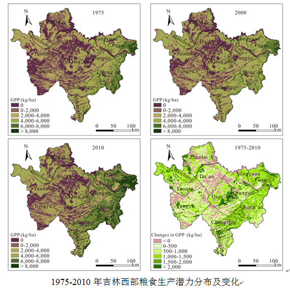 我所土地系統遙感學科組結合土地利用數據、氣象數據、土壤數據、DEM 數據和歷史統計資料等,采用全球農業生態區(GAEZ)模型,估算了吉林西部糧食生產潛力,進而分析了吉林西部糧食生產潛力對土地利用變化的響應。研究結果表明,在1975-2010年間,由于氣候、土地利用和灌溉水平的變化,吉林西部糧食生產潛力呈增加趨勢;雖然耕地面積的增加提高了糧食生產潛力,但其作用要遠小于氣候和灌溉水平的變化,而耕地增加的主要原因是草地和沼澤地被大面積地開墾為農田,導致了生態環境惡化趨勢加劇。因此,僅僅管控耕地數量并非是保障糧食安全的最優途徑,通過增加農業投入,改善土地質量,優化土地利用格局,恢復生態環境,從而提高糧食生產潛力,應是保障國家、區域糧食安全和實現土地可持續利用的更好選擇。
