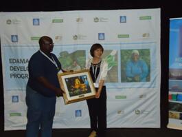 22日參加了由德班市政府、南非siyasebenza公司、KWAZULU-NATAL省農業及農村發展局及菜用大豆開發項目舉辦的“毛豆產銷及食品營養研討會”,參加會議來自省新聞媒體、各地市農業主管領導及菜用大豆推廣人員,共計180多人,大會特邀報告5人。我所張秋英研究員以“中國小規模毛豆生產技術”為題做了大會報告,她全面介紹了我國菜用大豆的生產歷史、育種成績、分區栽培方式和生理研究現狀,同時受到當地政府的嘉獎。