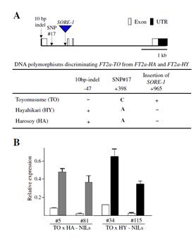 大豆光周期和成熟期的研究對于大豆適應(yīng)不同緯度以及大豆產(chǎn)量的提高具有重要意義。雖然目前已經(jīng)克隆的E1、E2、E3和E4基因的變異對大豆適應(yīng)不同光周期環(huán)境起著關(guān)鍵性的作用。但是,對于開花期和成熟期自然變異的分子機(jī)理研究較少。利用早熟品種構(gòu)建的雜交群體,我們檢測到兩個(gè)控制開花期的主要位點(diǎn):E1和E9。由于E1已經(jīng)被克隆,因此本研究以E9為切入點(diǎn),結(jié)合精細(xì)定位、測序和表達(dá)分析技術(shù),明確E9基因就是FT2a基因。無論是何種光周期條件,e9的轉(zhuǎn)錄表達(dá)水平始終低于E9,從而延遲開花期。此外,測序結(jié)果表明,E9和e9的編碼序列相同,但在啟動(dòng)子、非編碼區(qū)以及內(nèi)含子區(qū)域有一系列的單堿基置換、片段插入和片段缺失的變化。其中,e9在第一個(gè)內(nèi)含子中含有一個(gè)Ty1/copia類似的反轉(zhuǎn)錄轉(zhuǎn)座子SORE-1,高度甲基化的SORE-1雖然不會影響FT2a的RNA加工過程,但是SORE-1作為轉(zhuǎn)錄抑制因子,其插入會降低GmFT2a的表達(dá)水平。
