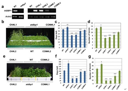 圖1. AtDBP1過表達植株與敲除的突變體的開花表型調(diào)查