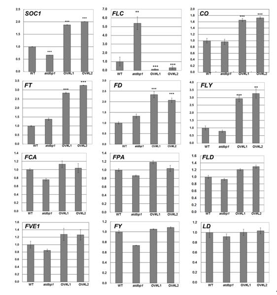 圖2. 開花途徑節(jié)點基因在AtDBP1過表達植株與敲除的突變體中的表達分析