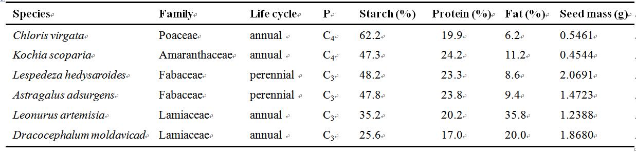 表1 六個物種所屬的科、生活型、光合途徑(P)、三大儲藏物質(zhì)所占的比例及種子千粒重