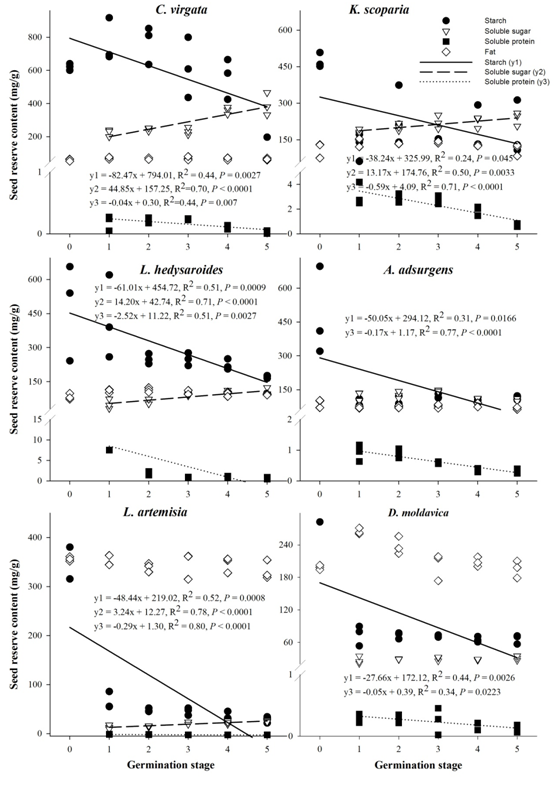 圖1 六個物種淀粉、脂肪、可溶蛋白、可溶糖含量在萌發(fā)過程中的回歸分析。0表示干種子,1表示吸脹,2表示1%萌發(fā),3表示50%萌發(fā),4表示最高萌發(fā),5表示早期幼苗階段。