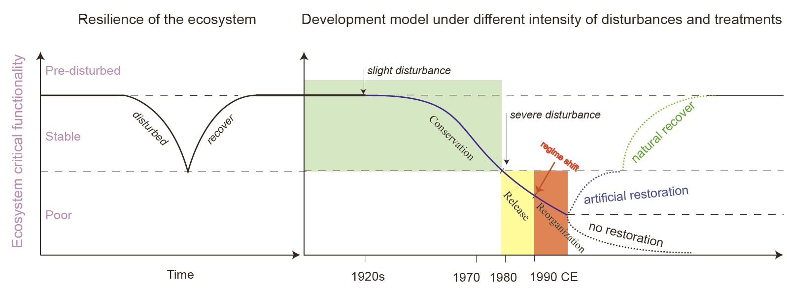 濕地生態(tài)系統(tǒng)相較于湖泊、河流生態(tài)系統(tǒng)等有著更強(qiáng)的彈性。對受損的濕地進(jìn)行恢復(fù),可以把該濕地“釋放”階段之前的生態(tài)特征作為濕地恢復(fù)的參考目標(biāo),之后濕地可通過自身的恢復(fù)力恢復(fù)到干擾前的狀態(tài),從而節(jié)約人工恢復(fù)成本和保持濕地恢復(fù)后的穩(wěn)定性。本研究得到國家自然科學(xué)基金(41571191; 41701217)和國家重點(diǎn)研發(fā)計(jì)劃(2016YFA0602301)的資助。相關(guān)研究成果發(fā)表在《Ecological Indicators》、《Science of the total Environment》上。