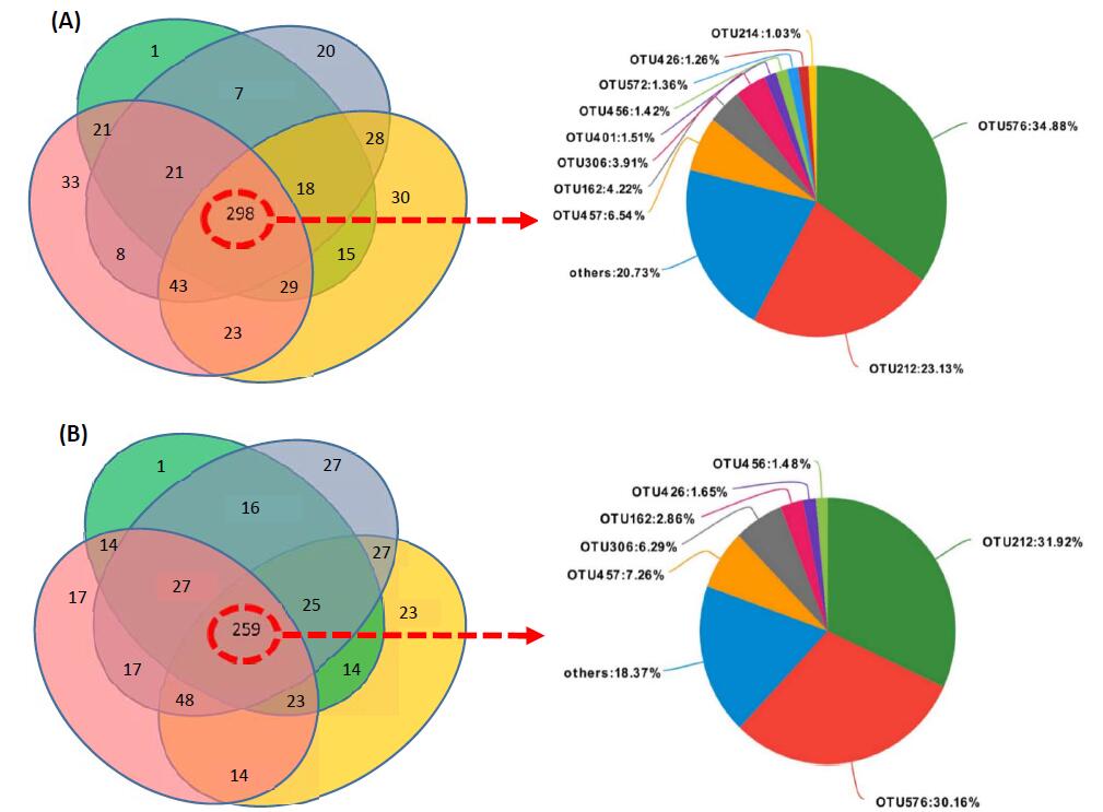圖1. CO2濃度升高(eCO2)(A)和正常濃度(aCO2)條件下(B)不同大豆品種根際固氮細菌群落OTU韋恩圖