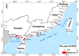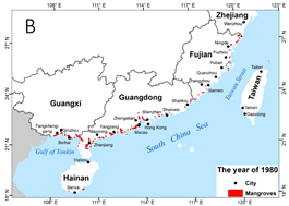 紅樹林是生長在熱帶、亞熱帶海岸潮間帶或河流入??诘哪颈局参锶郝?,具有防風(fēng)消浪、保護(hù)灘涂、凈化海水和促淤造陸等重要作用,是國際上濕地生態(tài)保育和生物多樣性保護(hù)的重要對象。然而近半個世紀(jì)以來,人類活動和自然環(huán)境的變化導(dǎo)致紅樹林資源急劇減少,全球35%的紅樹林在此期間消失。紅樹林不可取代的生態(tài)、經(jīng)濟、社會效益,以及面臨著自然和人為雙重脅迫下急劇銳減的嚴(yán)峻形勢,使得紅樹林保護(hù)和管理越來越受到世界各國的重視。在中國,上世紀(jì)后50年紅樹林遭到嚴(yán)重破壞,其損失速率顯著高于世界平均水平。自20世紀(jì)90年代中期開始,中國政府頒布了一系列紅樹林保護(hù)的法律和條例,但是關(guān)于紅樹林保護(hù)成效的研究甚少。特別是在國家尺度上,紅樹林保護(hù)的成效如何?各個保護(hù)區(qū)的建立是否起到了保護(hù)當(dāng)?shù)丶t樹林的作用?等等相關(guān)問題還沒有明確的答案。這些問題的解答對于制定合理的濱海濕地保護(hù)、恢復(fù)和資源利用政策意義重大,對于建設(shè)“美麗中國”這一生態(tài)文明目標(biāo)的相關(guān)工作也具有重要的借鑒意義。