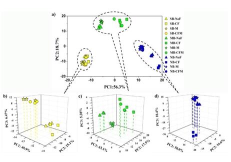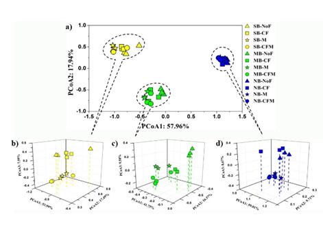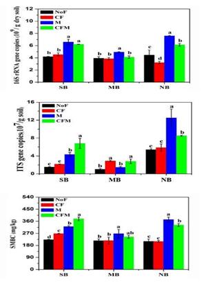 為了維持和提高農(nóng)田土壤生產(chǎn)力,向土壤中施加肥料已成為常規(guī)的農(nóng)業(yè)生產(chǎn)管理措施。國內(nèi)外許多資料表明,肥料管理對土壤微生物影響明顯,但不同區(qū)域的研究結(jié)果不盡相同。東北黑土是地帶性土壤,前期研究發(fā)現(xiàn)東北黑土農(nóng)田土壤微生物存在明顯的地理分布格局,但長期相似的施肥管理能否驅(qū)動不同地點的微生物群落結(jié)構(gòu)具有趨同性?有機肥和化肥對黑土區(qū)土壤微生物如何影響?為回答上述問題,東北地理所農(nóng)田分子生態(tài)學(xué)科組與相關(guān)單位合作,從黑土區(qū)南部公主嶺(SB)、中部哈爾濱(MB)和北部黑河(NB)3個長期定位施肥試驗站,選取4種相似的施肥制度:NoF(無肥),CF(單施化肥),M(單施有機肥)和CFM(化肥有機肥配施)的耕層土壤為研究對象,采用熒光定量PCR和Illumina Miseq高通量測序技術(shù),對比研究了長期相同施肥制度下3個地點土壤微生物豐度及群落結(jié)構(gòu)分布特征,以及長期不同施肥制度對單個地點土壤微生物豐度及群落結(jié)構(gòu)的影響。研究發(fā)現(xiàn),施用有機肥增加了黑土區(qū)土壤微生物豐度和土壤微生物量碳含量(圖1),顯著增加富營養(yǎng)型細菌和植物有益真菌的含量(圖2);而化肥的添加會導(dǎo)致潛在植物致病真菌含量的增加(圖3)。研究同時發(fā)現(xiàn)3個地點盡管經(jīng)歷了長期不同的肥料處理,但相同的施肥方式并沒有驅(qū)動土壤微生物向同質(zhì)化方向演替,地域差異仍是決定東北黑土區(qū)土壤細菌和真菌群落結(jié)構(gòu)組成的主導(dǎo)因素,長期不同施肥管理僅在局部地區(qū)對土壤微生物群落產(chǎn)生微調(diào)作用(圖4和圖5)。該研究進展進一步佐證了黑土農(nóng)田土壤微生物地理分布格局的存在,同時也表明黑土帶上“一方水土生存一方微生物”。