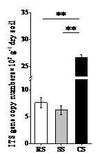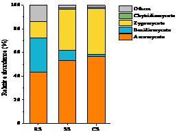 東北地理所土壤物質(zhì)循環(huán)學(xué)科組科研人員以大豆-玉米-小麥輪作(RS),大豆短期連作(小麥-大豆-大豆)(SS)和大豆長(zhǎng)期連作(CS)的大豆根圍土壤為研究對(duì)象,采用qPCR及高通量測(cè)序(MiSeq)技術(shù),探索長(zhǎng)期連作對(duì)大豆田土壤真菌豐度、群落結(jié)構(gòu)和一些功能菌群的影響。結(jié)果表明:大豆長(zhǎng)期連作土壤真菌豐度顯著高于大豆輪作和大豆短期連作(圖1)。大豆輪作和短期連作土壤中真菌優(yōu)勢(shì)菌門是Ascomycota、Basidiomycota和Zygomycota,但長(zhǎng)期連作土壤中Basidiomycota不再是優(yōu)勢(shì)菌門(圖2)。主坐標(biāo)分析(PCoA)顯示,連作對(duì)土壤真菌群落組成和結(jié)構(gòu)影響顯著,長(zhǎng)期連作和短期連作對(duì)土壤真菌群落影響也不同(圖3)。Lefse分析表明潛在的致病菌(Alternaria和Boeremia)在大豆短期連作中起主要作用,潛在的有益菌(Clonostachys、Metacordyceps和Metarhizium)在大豆長(zhǎng)期連作中起主要作用(圖4)。進(jìn)一步分析發(fā)現(xiàn)大豆連作后分別有10個(gè)潛在的致病菌和有益菌相對(duì)豐度發(fā)生顯著變化,大豆連作后致病菌相對(duì)豐度增加的同時(shí)有益菌相對(duì)豐度也在顯著增加(圖5)。