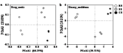 圖3基于Bray(a)和Binary(b)距離矩陣大豆輪作和連作真菌群落的主坐標(biāo)分析(PCoA)