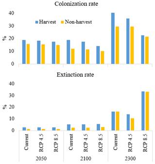 圖2.樹種(以white oak 為例)在2050年、2100年和2300年的定殖率(colonization rate, top left)及滅絕率(extinction rate, bottom left)以及樹種在2300年的空間分布變化(right)
