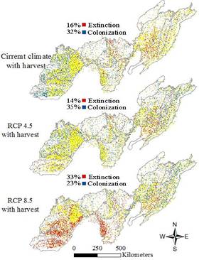 研究發現大部分的北方、廣分布及少數南方樹種的分布面積將縮減,大部分的南方樹種的分布面積將擴張;種群動態是影響樹種分布變化最重要的過程;在短期和中期,采伐的作用比氣候變化的作用大,但在長期,氣候變化的作用比采伐的作用大,采伐和氣候變化有交互作用,采伐將加速由氣候變化導致的分布面積縮減(特別是北方樹種)和分布面積擴張(特別是南方樹種);樹種生物屬性如繁殖能力、成熟時間、擴散能力對未來樹種分布變化起到很重要的作用。該研究強調了在氣候變化下,種群動態和采伐對提高未來樹種分布預測起到很重要的作用,在理論上把影響樹種分布的多尺度過程納入對氣候變化響應的預測,完善了樹種分布預測的模型理論,提高了預測的真實性;在應用上為資源管理和物種保護提供理論基礎,也為制定適應氣候變化的策略提供科學支撐。