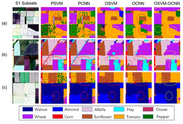 圖 2 OSVM-OCNN及幾種基準(zhǔn)算法生產(chǎn)的土地覆被分類圖
