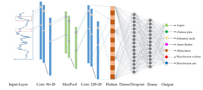研究人員首次將我國自主生產的高光譜遙感影像數據OHS-1應用于優勢樹種分類研究,發揮其高光譜分辨率(2.5nm)和高空間分辨率(10m)的優勢,同時,引入深度學習算法(一維深度卷積神經網絡模型Conv1D),在有限的樣本數據條件下,選擇光譜特征和樹冠紋理特征(熵和均值)作為分類特征參數,通過優化卷積核大小及卷積層數等參數的設置,實現了東北長白山典型森林樣區優勢樹種的高精度識別。基于地面調查樣點的精度驗證結果表明,深度學習模型的總體分類精度(85.04%)高于隨機森林模型(80.61%),尤其是對于光譜特征相似的闊葉樹種(如核桃楸和白楊),深度學習模型的自動識別精度(87.15%)顯著高于隨機森林模型(71.77%)。因此,基于卷積的深度學習框架結合高光譜影像數據能夠有效提高樹種分類的準確性,具有廣闊的應用前景。