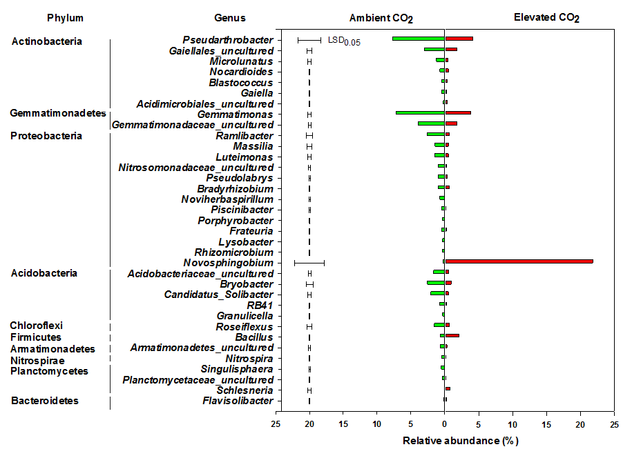 圖1進行13CO2標記的大豆根際土壤13C-DNA組分中屬水平細菌的相對豐度。此圖中僅展示對不同CO2濃度處理有顯著(p< 0.05)響應的屬。