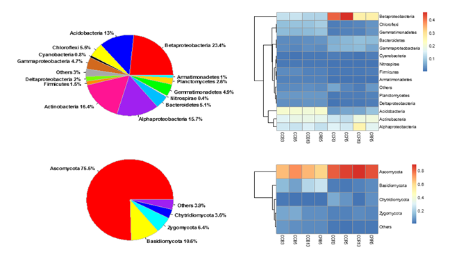 圖1不同處理下細(xì)菌與真菌群落組成及聚類分析圖譜